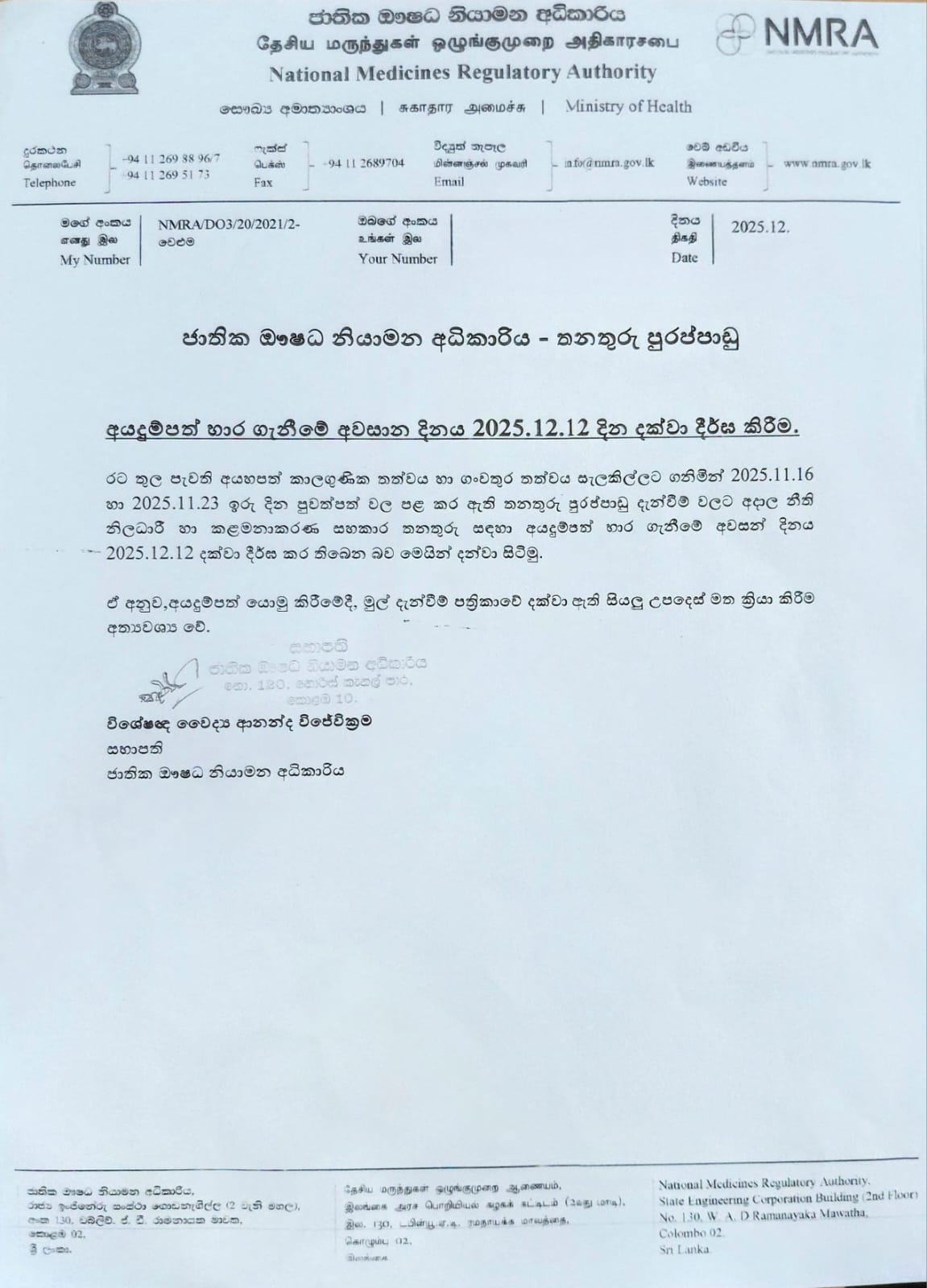 ජාතික ඖෂධ නියාමන අධිකාරිය වෙනුවෙන් අවබෝධතා ගිවිසුම සකස් කිරීම සම්බන්ධයෙන් උනන්දුවක් දක්වන සිවිල් නීති ක්ෂේත්රයේ(ගිවිසුම් නීතිය) සම්බන්ධ වසර දහයක පළපුරැද්ද සහිත නීතිඥවරැන්ගෙන් අයඳුම්පත් කැඳවනු ලැබේ.රාජ්ය අංශයට ඉහත අවබෝධතා ගිවිසුම් සකස් කිරීමේ සේවා සපයා තිබීම විශේෂ සුදුසුකමක් වේ.
